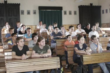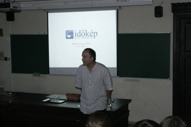 Szinte teljesen megtelt a Fizika előadó. Szente-Varga Bálint elkezdi előadását, az Időkép internetes időjárási weboldalról beszél.