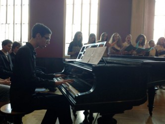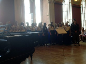 A nem éppen ideális kora délutáni időpont, és a viszonylag kis hírverés ellenére a díszterem szinte teljesen megtelt, egy-két osztály majdnem teljes létszámban képviselte magát. Az előadást iskolánk tanulói kezdték. A kórustagok komolyzenei művekkel kápráztatták el a közönséget. Ezt követően a 28 tagú, gyönyörű hangú lányokból és két fiúból álló dán kórus énekelt, mely, mint később megtudtuk, először szerepelt külföldön. Műsorukat modern amerikai popslágerekkel kezdték. Hallottuk többek között a mindenki által kedvelt Hallelujah egyik feldolgozását, valamit egy amerikai film betétdalát is, a Cup Songot. De ezzel még nem ért véget a produkciójuk, mert dánul, sőt még magyarul („Még azt mondják nem illik”) is énekeltek. Az előadást Benjamin Britten „The Salley Gardens” című dala zárta, melyet a két kórus közösen adott elő. A két énekkar - bár egyszer sem gyakoroltak együtt -, az előadással rendkívüli sikert aratott.