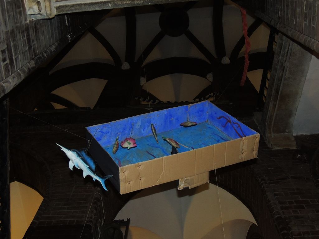A díszterem minden részét megpróbálták kihasználni, ugyanis nemcsak a színpadon, hanem a színpad mellett, illetve a nézők között is játszottak. A színpad szélén a fogorvos rendelőjének akváriumát láthattuk, amiben az egész darab alatt beleélték a szerepükbe magukat a lányok. Jól megfigyelhető volt, hogy még az akváriumi élőlényeknek is a jelmezei, és a sminkek is nagyon jól ki voltak találva. Hasonlított a mesében lévő állatok külsejéhez!