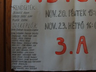 Az előadás előtt szerte az iskolában már láthattuk a 3.a osztály darabjának, az Abigélnek a plakátjait, melyeket a könyvből jól ismert részlet díszített: "Ne ontsátok értelmetlenül a magyar vért! A háborút elvesztettük. Őrizzétek meg fiaitokat egy értelmesebb jövőnek!"