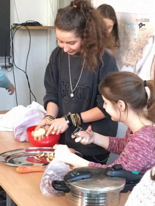 Amint beszabadultunk, kisebb csoportokban azonnal nekiláttunk az ételek elkészítésének Berkó tanárnő segítségével.