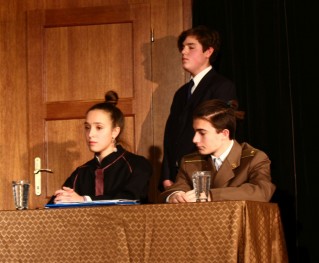 Négy szereplő is volt, aki a darab teljes hossza alatt a színpadon tartózkodott: a már említett vádlott, a bírósági elnök (Lökkös Júlia), az államügyésznő (Nagy Lili), illetve a védő (Kovári Lilla). Nagy érettségre vall, hogy a felsorolt diákok egy ilyen komoly bírósági tárgyalás idegőrlő hangulatát hitelesen át tudták adni. A tárgyalás egyébként száraz hangulata ellenére remekül elkülönültek a megjelenített karaktertípusok. A temperamentumos védő ellensúlyozta a tárgyilagos és racionalista ügyésznőt, Horváth Vilmos pedig jól láthatóan építette fel a darab kezdetétől fogva egy súlyosan vádolt személy karakterét. Mindezek mellett Lökkös Júlia kiválóan alakította a pártatlan bírót, ezzel enyhítve a többi szereplő közti feszültséget.