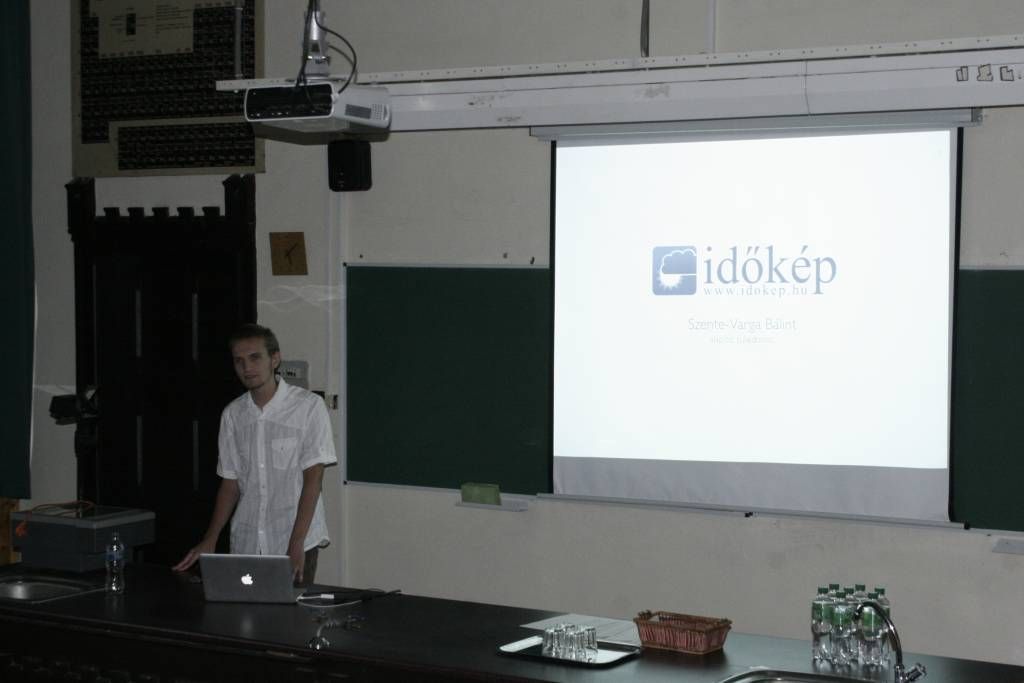 Szinte teljesen megtelt a Fizika előadó. Szente-Varga Bálint elkezdi előadását, az Időkép internetes időjárási weboldalról beszél.