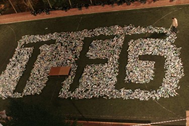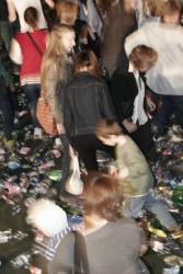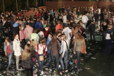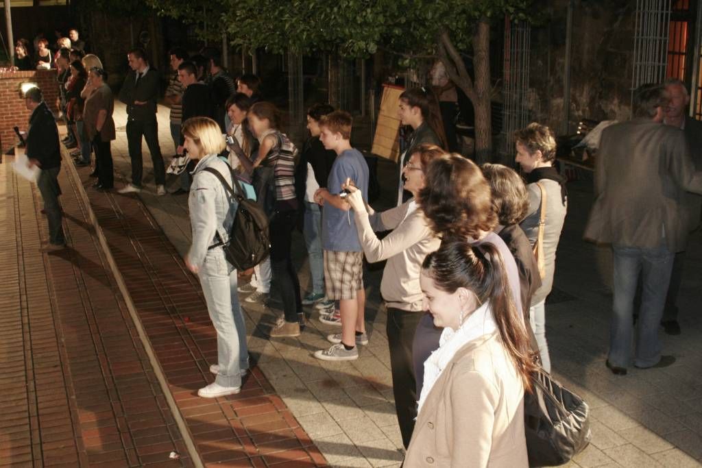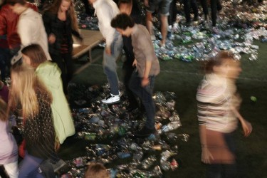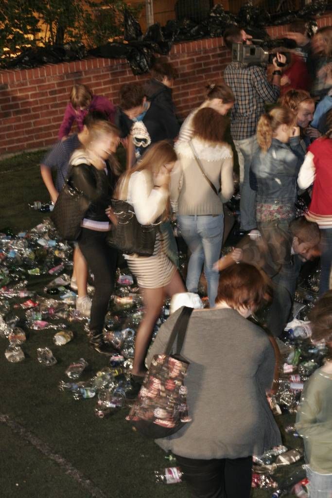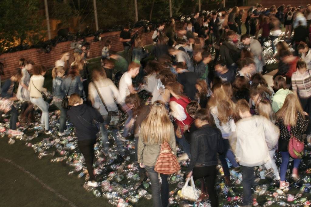 Este kilenckor kezdődött a „nagy taposás” Gundel Takács Gábor vezetésével, amin nagyon sok ember részt vett, fiatalok és idősek egyaránt. Miután mindenki összetaposott mindent, újra beleraktuk a palackokat a zsákokba, de így már csak 24 zsákot töltöttek meg!!! Ezzel tökéletesen illusztráltuk, hogy mennyi helyet meg lehet spórolni a palackok összenyomásával. :-)