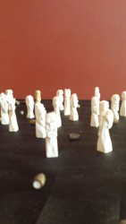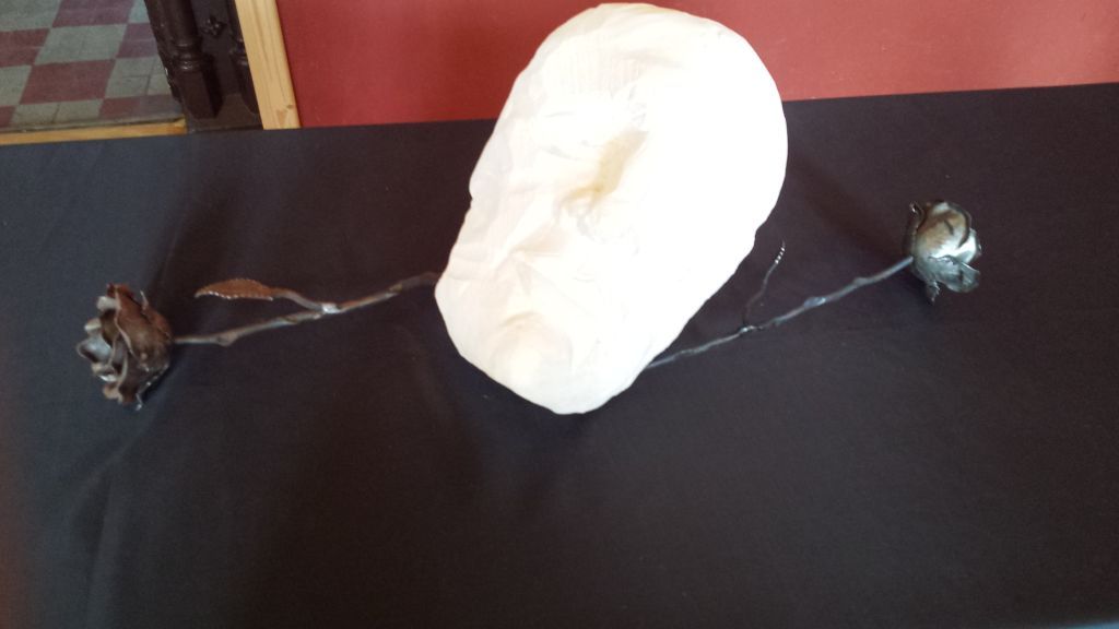A kiállításon is látszott, és ezt később ő is megerősítette, hogy szobrászkodni szeret leginkább. Sokféle méretben láthattunk szobrokat, a terem közepén volt elhelyezve a két remekmű, a két faszobor. Groteszk kinézetük és részletességük megdöbbentette a vendégeket, mondhatni ez a két mű volt a legsikeresebb és legnépszerűbb alkotás. Továbbá még néhány kiemelhető szobor, mint például a gömb alakú, termőföldből faragott arcok, illetve a hatalmas, mészkőből készült fej, ami mellett két szép szál vasrózsa feküdt.