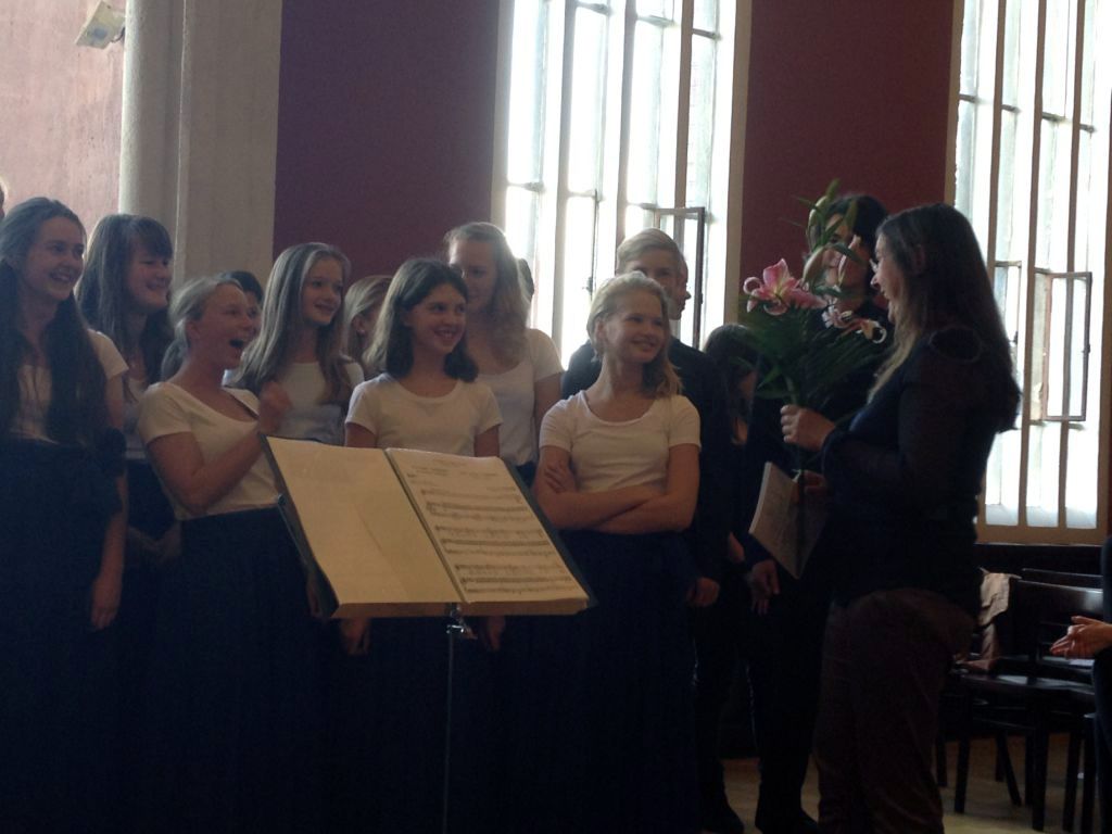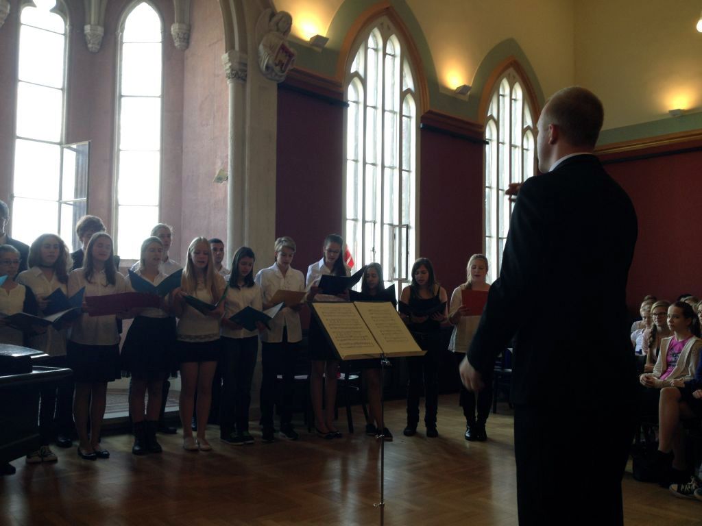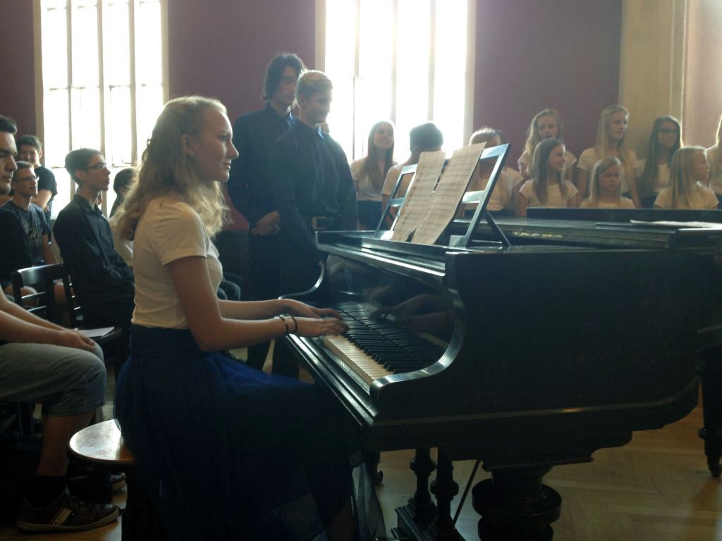 A nem éppen ideális kora délutáni időpont, és a viszonylag kis hírverés ellenére a díszterem szinte teljesen megtelt, egy-két osztály majdnem teljes létszámban képviselte magát. Az előadást iskolánk tanulói kezdték. A kórustagok komolyzenei művekkel kápráztatták el a közönséget. Ezt követően a 28 tagú, gyönyörű hangú lányokból és két fiúból álló dán kórus énekelt, mely, mint később megtudtuk, először szerepelt külföldön. Műsorukat modern amerikai popslágerekkel kezdték. Hallottuk többek között a mindenki által kedvelt Hallelujah egyik feldolgozását, valamit egy amerikai film betétdalát is, a Cup Songot. De ezzel még nem ért véget a produkciójuk, mert dánul, sőt még magyarul („Még azt mondják nem illik”) is énekeltek. Az előadást Benjamin Britten „The Salley Gardens” című dala zárta, melyet a két kórus közösen adott elő. A két énekkar - bár egyszer sem gyakoroltak együtt -, az előadással rendkívüli sikert aratott.