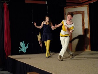A díszterem minden részét megpróbálták kihasználni, ugyanis nemcsak a színpadon, hanem a színpad mellett, illetve a nézők között is játszottak. A színpad szélén a fogorvos rendelőjének akváriumát láthattuk, amiben az egész darab alatt beleélték a szerepükbe magukat a lányok. Jól megfigyelhető volt, hogy még az akváriumi élőlényeknek is a jelmezei, és a sminkek is nagyon jól ki voltak találva. Hasonlított a mesében lévő állatok külsejéhez!