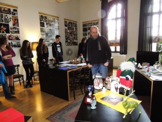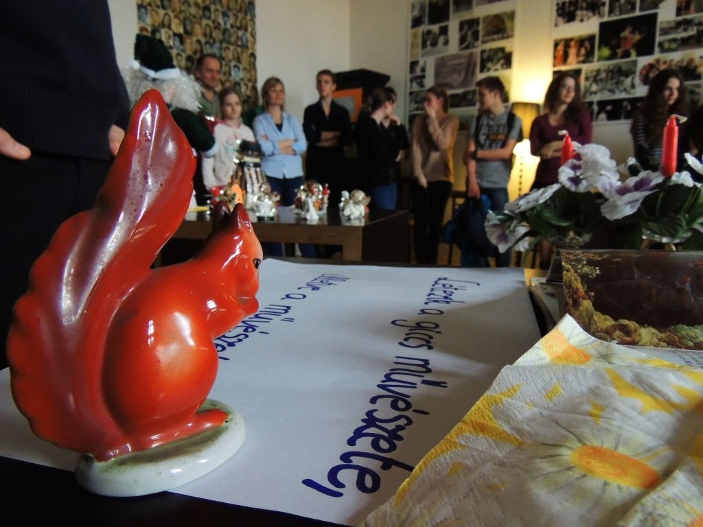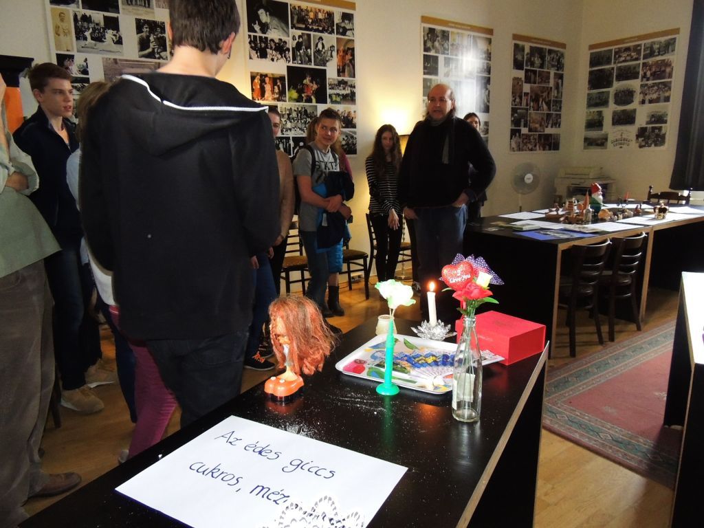 A megnyitón Németh György tanár úr szólt néhány szót, amelyben megköszönte osztályának a kiállításba fektetett munkát, majd egy díszes dobozból körbekínált bennünket kockacukorral. Majd a giccsről beszélt. Na de mi is az a giccs? A kiállításon látható rengeteg idézetet és meghatározást elolvasva talán mindenkinek sikerült összerakni ezt a bonyolult fogalmat.