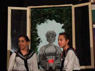 Számomra két igazán érdekes és izgalmas megoldás volt, amit mindenképp megemlítenék. Egyrészt maga az Abigél szobor, melyet gyönyörűen megfestettek, és a színpad hátsó, középső részében helyeztek el, kezében egy kis tartállyal, ahonnan Gina (Nyirády Loretta) mindig a megfelelő időben kivette az üzeneteket, amelyeket a szobortól kapott. Másrészt az a jelenet, amikor Georgina a szerelmével, Kuncz Ferivel (Lajer Máté) beszélget. Nehezen tudtam elképzelni az előadás előtt, hogy miként lehet egy színpadon egy kaput megjeleníteni, melynek mindkét oldalát egyszerre kell látnunk. De ezt az akadályt is sikerrel vette a 3.a osztály. Ötletesen oldották meg a problémát a rendezők: Sengler Anna, Várady Szabó Kata és Pintér Zsófia. Behúzták a függöny egyik felét, és míg Gina a színpad széléről beszélt szerelméhez, addig Kuncz hadnagy a színpad előtt állva válaszolt neki.