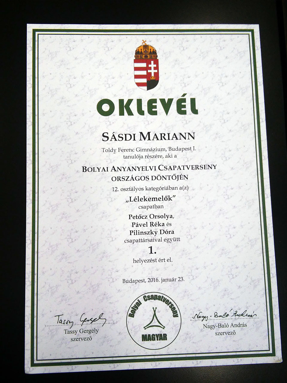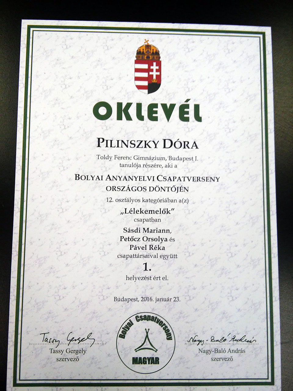 Utána a csapat Pável Réka, Petőcz Orsolya, Pilinszky Dóra, Sásdi Mariann együttműködésével az országos döntőben is az első helyen végzett.