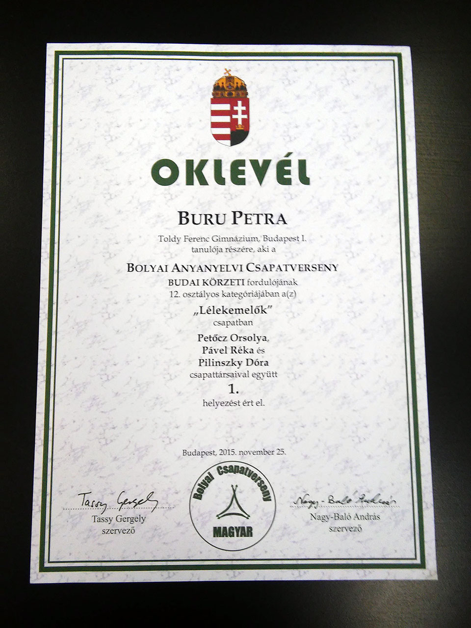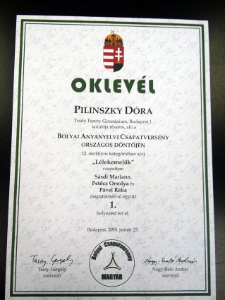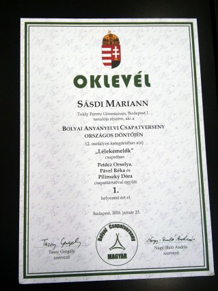 A Lélekemelők csapat, Buru Petra, Pável Réka, Petőcz Orsolya, Pilinszky Dóra (6.b) részvételével 100%-os eredménnyel első lett a budai körzeti Bolyai magyar versenyen.