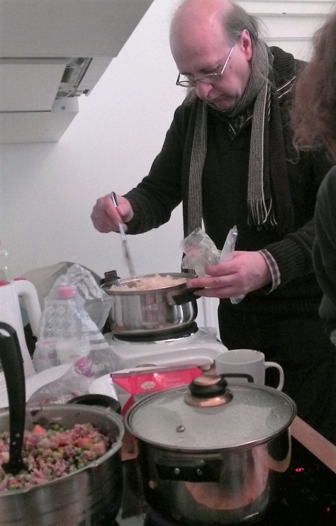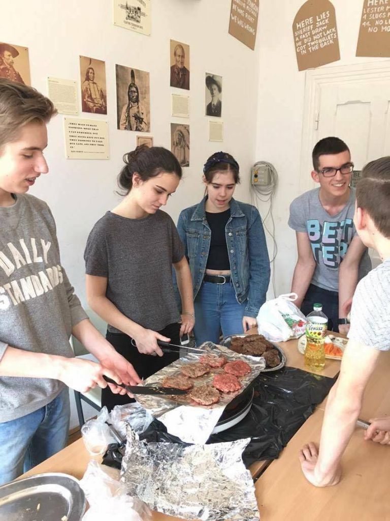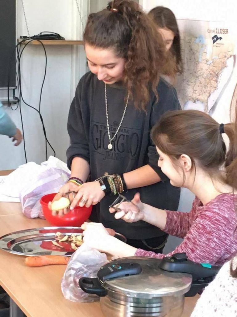 A később érkezők láthatták, amint a kicsit sem halk és nagyon lelkes csapat kétféle salátát, shepherd's pie-t (pásztorpitét), kínai tésztát, húspogácsákat, krumplipürét és gyümölcsös tiramisut próbál gusztusos formában elkészíteni.