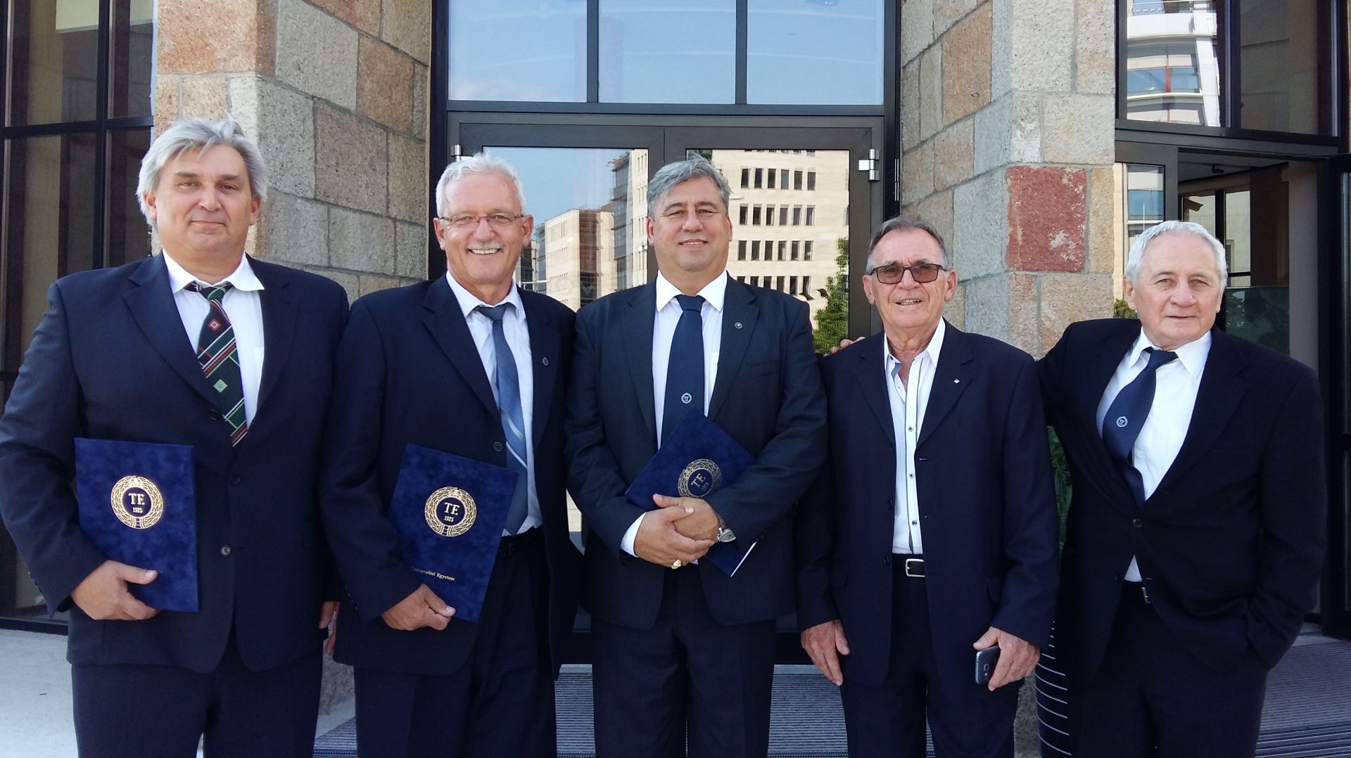 Takács tanár úr a Testnevelési Egyetem rektorával, Mocsai Lajossal (középen), valamint további kitüntetettekkel (balról jobbra): Gábor Áron, Dr. Molnár Sándor, Dr. Kovács Etele