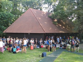 A kellemes, csaknem egy órás buszos, majd kompos utazást követően megérkeztünk Horányba, elfoglaltuk faházainkat, berendezkedtünk a táborban, majd irány az első közös ebéd, mely előrevetítette azt is, hogy a gólyatábort nem elsősorban a koszt fogja emlékezetessé tenni… A délután már az ismerkedéseké, kisebb-nagyobb társaságok kialakulásáé volt. A vacsora utáni tábortűznél együtt énekeltünk, ekkor éreztem azt először, hogy valóban toldys lettem!