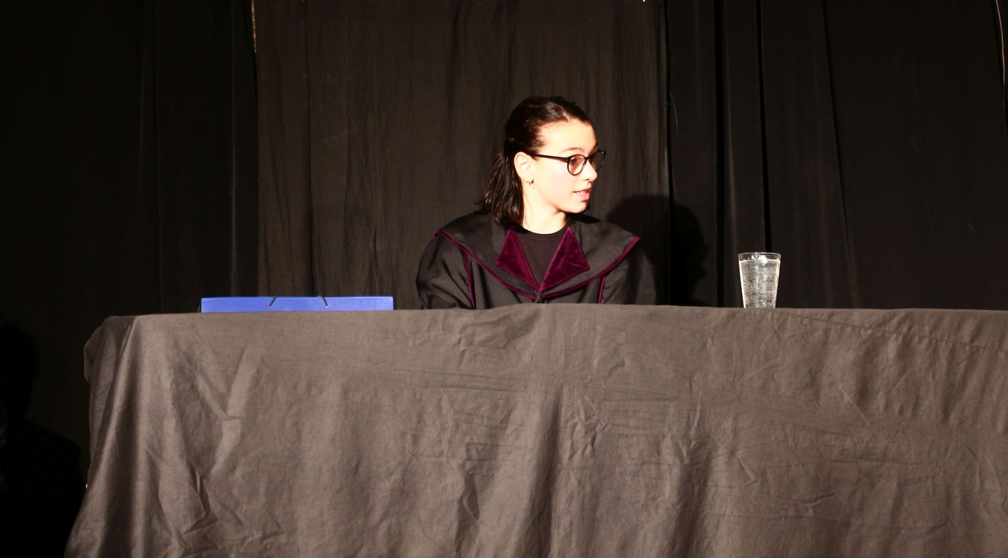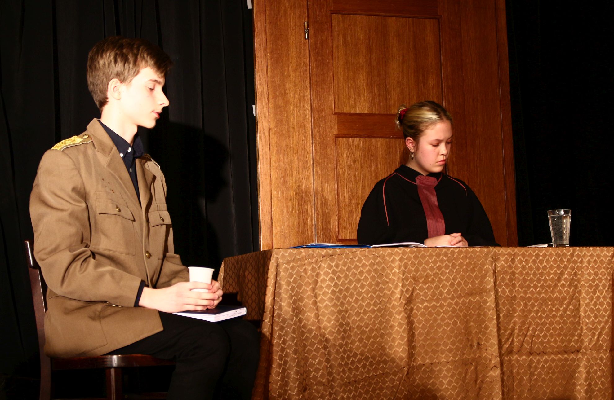 Négy szereplő is volt, aki a darab teljes hossza alatt a színpadon tartózkodott: a már említett vádlott, a bírósági elnök (Lökkös Júlia), az államügyésznő (Nagy Lili), illetve a védő (Kovári Lilla). Nagy érettségre vall, hogy a felsorolt diákok egy ilyen komoly bírósági tárgyalás idegőrlő hangulatát hitelesen át tudták adni. A tárgyalás egyébként száraz hangulata ellenére remekül elkülönültek a megjelenített karaktertípusok. A temperamentumos védő ellensúlyozta a tárgyilagos és racionalista ügyésznőt, Horváth Vilmos pedig jól láthatóan építette fel a darab kezdetétől fogva egy súlyosan vádolt személy karakterét. Mindezek mellett Lökkös Júlia kiválóan alakította a pártatlan bírót, ezzel enyhítve a többi szereplő közti feszültséget.
