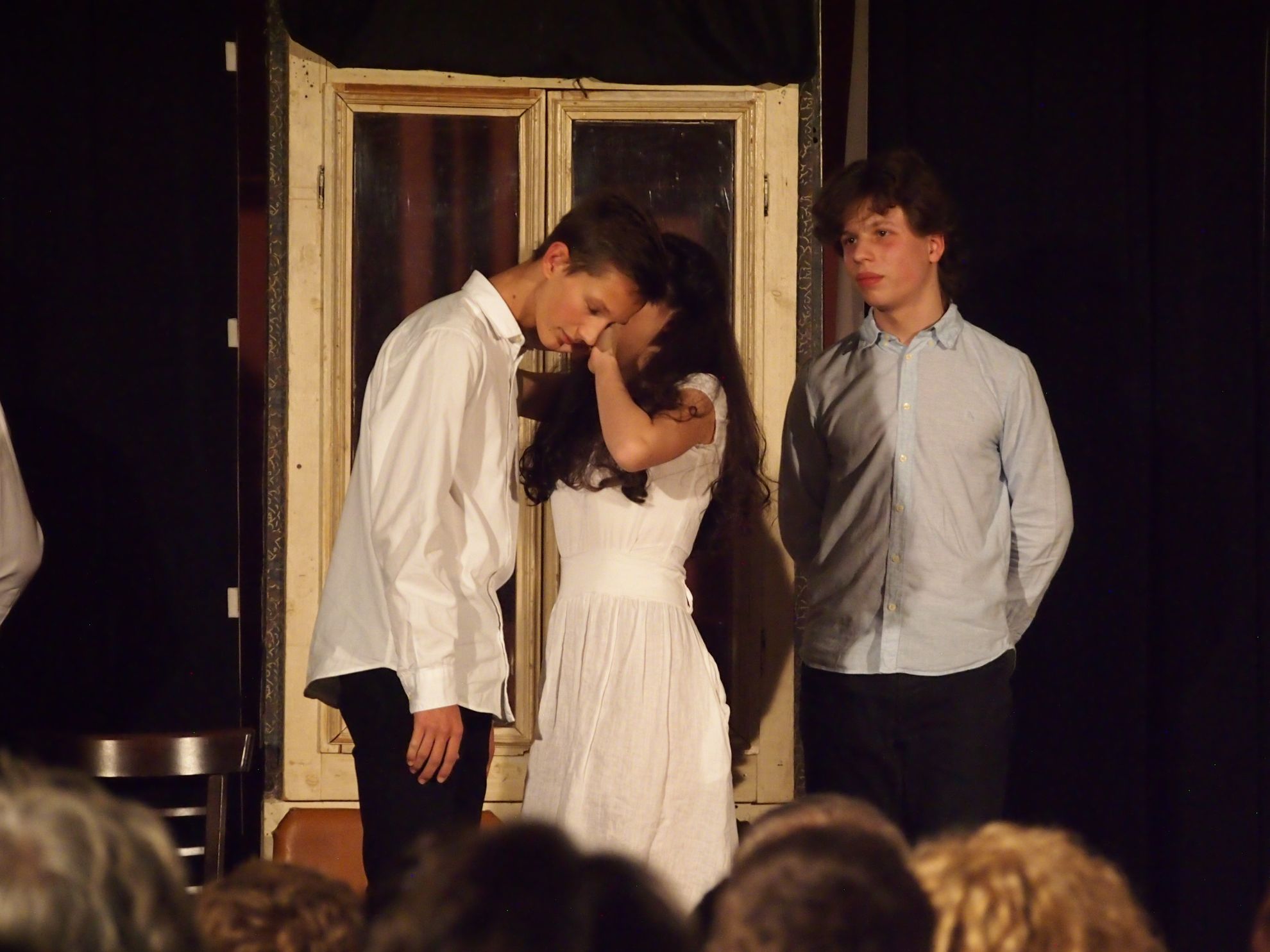 Ezekkel a nehézségekkel ment szembe a 3. a, amikor vakmerően, de tudatosan belevágtak a darabba. Izgatottan foglaltam helyet a hátsó sorokban, kíváncsian várva a produkciót. A nyitány alatt szóló komolyzenei mű, amit élőben adtak elő az osztály tehetséges zenészei, megadta azt a hangulatot, amire én vágyom egy komoly klasszikus előadásnál. Méltó volt a darabhoz és a műhöz is. Tetszett többek között az eltérő művészeti ágak okos összehangolása. Ide tartozott a vissza-visszakacsintó zene is, amit az imént említettem, plusz a színpadon nagyon jól mutató tánc koreográfia.