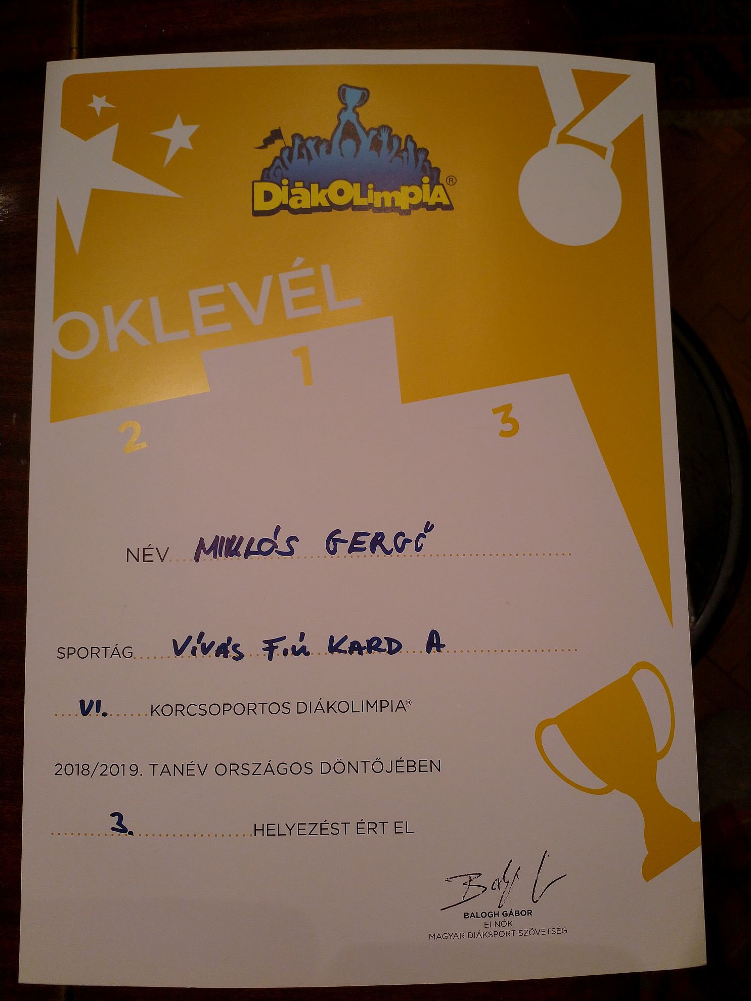 Gergő (5. b) a vívó diákolimpia kard egyéni versenyének országos döntőjében végzett a harmadik helyen.