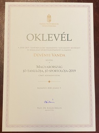Vanda (6. a) kiérdemelte a Magyarország jó tanulója, jó sportolója címet.